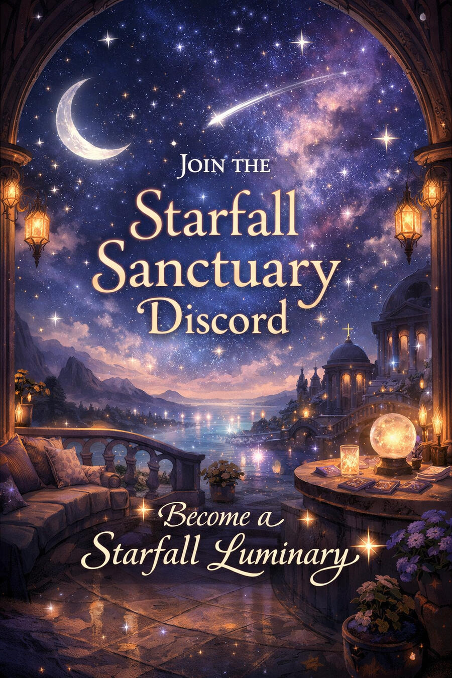 Starfall Sanctuary is a celestial lounge designed for relaxation and connection.