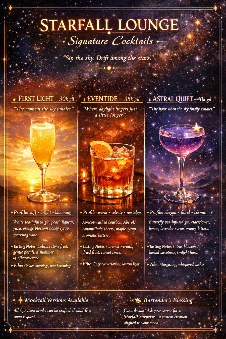 Starfall Sanctuary is a celestial lounge designed for relaxation and connection.
