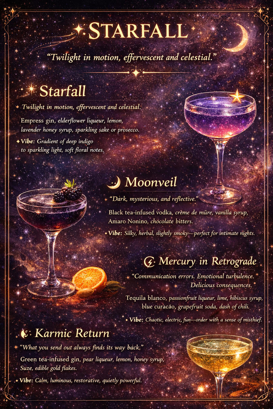 Starfall Sanctuary is a calm, astrology-inspired lounge built on good karma, gentle music, and intentional connection.